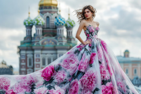 Fashion model wearing lush floral dress posing in front of church of the savior on spilled blood