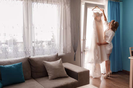 Bride morning preparation. happy beautiful young woman in silk bathrobe touching her wedding dress while standing near the window.