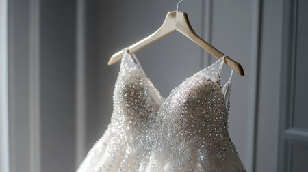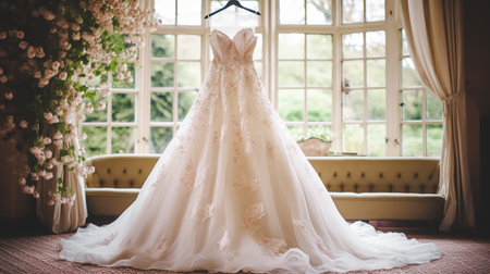 A stunning wedding dress gracefully hangs in a beautifully designed room, showcasing elegance and charm. Perfect for bridal and wedding-themed projects.