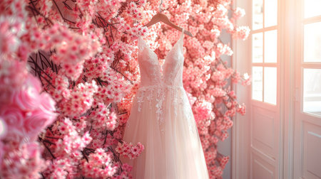 A stunning wedding dress hangs on a hanger among vibrant pink blossoms, creating a romantic atmosphere in a sunlit room with white doors.