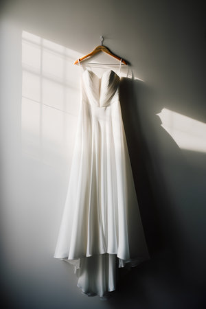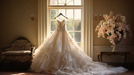 Exquisite wedding dress hanging by a window, illuminated by warm sunlight. The intricate lace details and elegant design make it a stunning bridal choice.