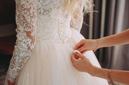 Fashionable bridesmaids dresses helped wear bow on back of wedding dress bride. Morning wedding day.
