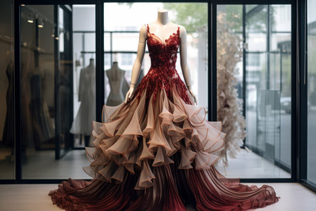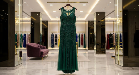 Elegant luxury dress on display in mall with copy space, fashion boutique showcase