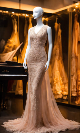 Elegance unveiled: a captivating display of a beautiful, luxurious evening gown gracefully adorning a mannequin, epitomizing timeless style and opulence for a glamorous and chic affair.