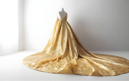 Luxurious European princess dress on a mannequin, no people, with ample copy space on a clean background.