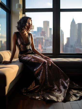 Beautiful sexy young brunette woman in a long evening dress sitting on a sofa by the window in New York City.