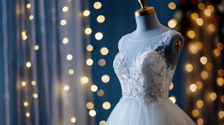 This image features an elegant white wedding dress showcased on a mannequin, beautifully adorned with delicate lace and intricate details, with soft fairy lights in the background, creating a romantic and enchanting atmosphere perfect for bridal fashion content.