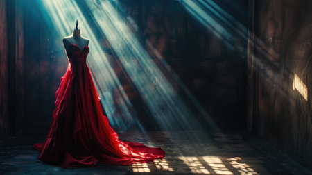 Elegant red evening gown on mannequin in dramatic, shadowy room with sunbeams filtering through window
