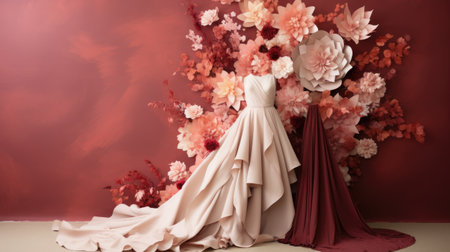 Wedding dress on the background of a red wall with flowers