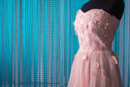 the process of making clothes. Professional designer, handmade craftsman, sews flowers on a pink dress, on a mannequin, in a workshop. Tailoring, women's dress. Pink wedding dress