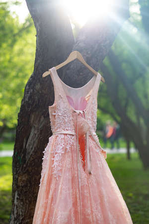 Peach color wedding dress hanging on a hanger in the park