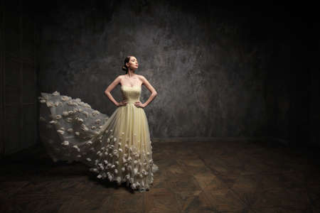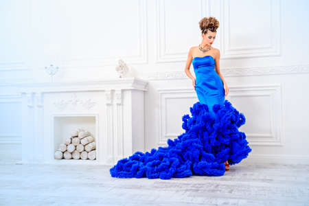 Beautiful young woman in a long evening dress in a vintage interior