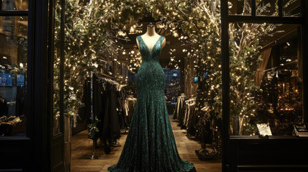 A stunning green evening gown is showcased in a stylish boutique window, surrounded by enchanting holiday lights, creating a magical shopping experience.