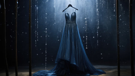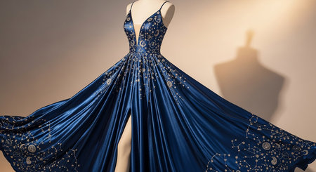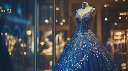 A blue evening dress on a mannequin, with intricate details and a flowing fabric, captured in a well-lit studio setting to highlight its elegant color