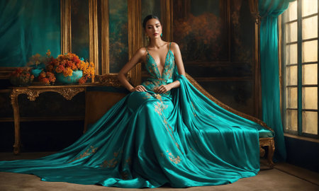Beautiful girl in a blue evening turquoise dress posing. ai generative.