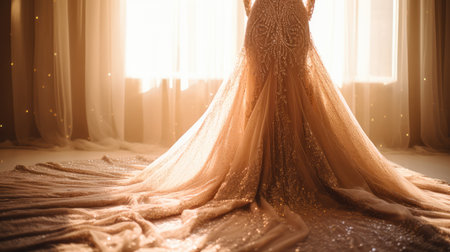 Elegant wedding dress on a hanger in a soft-lit room, capturing the beauty and dreamlike moment before the ceremony.