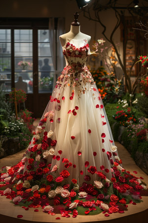In a serene room, a mannequin showcases a dress of exquisite design. The dress features a fitted bodice and a full skirt covered in petals and blossoms, reflecting the artistry and craft of couture.