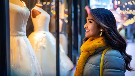 A girl on the street looks into a glowing shop window at wedding dresses. The girl dreams of marriage near a wedding dress shop.