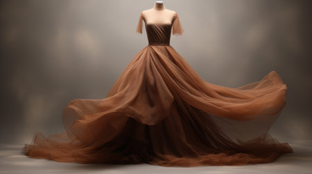 an evening gown on a mannequin, showcasing a conceptual elegance with its earthy color palette and ethereal images. the dark amber tones add a touch of mystery to this contemporary fairy tale-inspired design. meticulously crafted with a monochromatic study, this gown embodies a unique and captivating style. ai generated