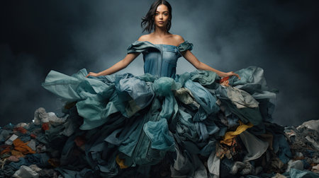 Young woman in a blue dress is standing on a pile of garbage