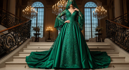 Luxury green evening dress on mannequin, delicate lace, ball gown, displayed in luxurious boutique. Generative AI