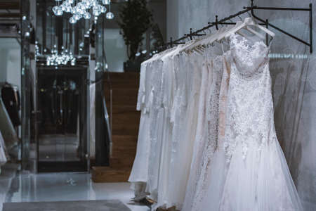 Beautiful wedding dresses in a bridal salon.