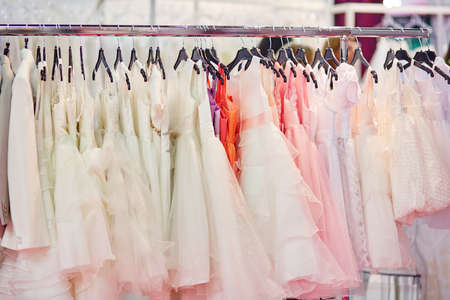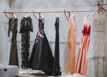 Beautiful evening dresses on a hanger in the store. Selective focus.