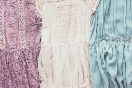 Toned photo of girls fashion background, lace and tulle dresses in pastel colors, flat lay, top view, selective focus