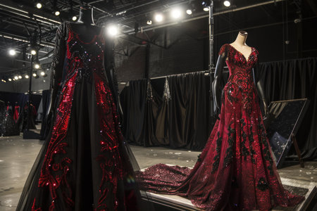 Luxurious red and black evening dresses showcased with elegant lighting