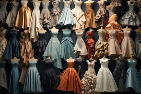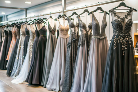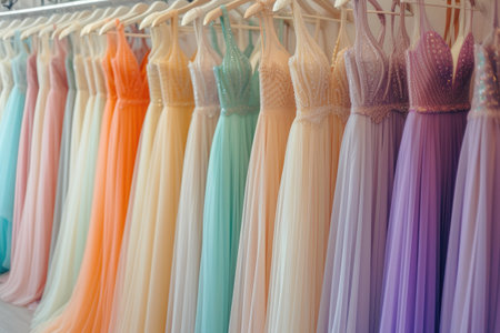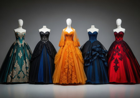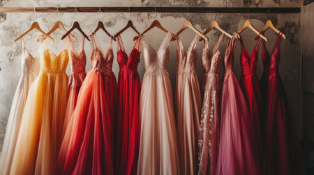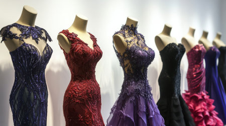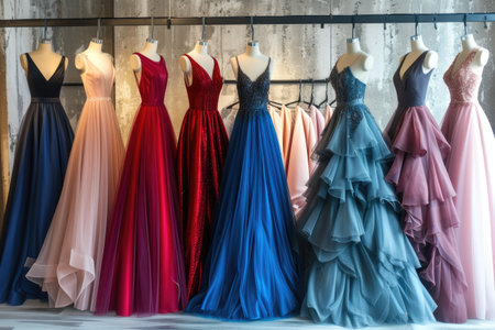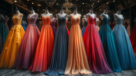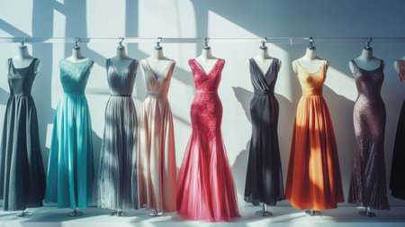 A striking display of evening dresses in various shades showcases the elegance of fashion design. Perfect for inspiring formal attire choices.