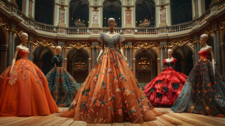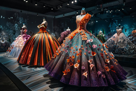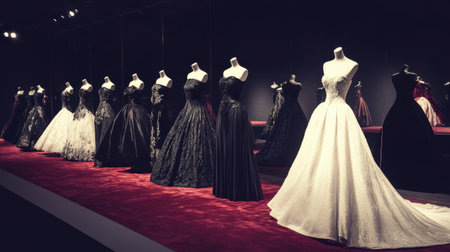 A stunning display of elegant evening gowns showcased on mannequins in a chic exhibition setting, highlighting intricate details and luxurious fabrics.