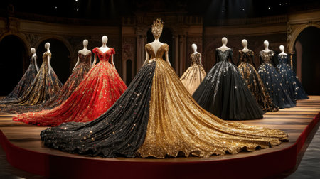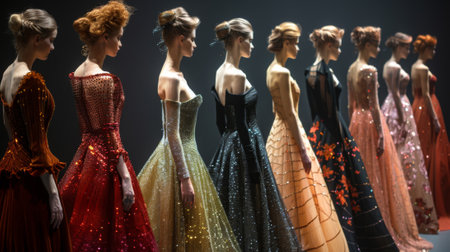 A captivating collection of exquisite couture dresses showcased in a stunning fashion setting, featuring mesmerizing sparkles and intricate designs.