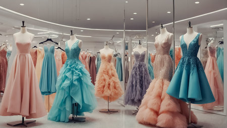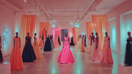This image showcases a stunning fashion gallery filled with an array of colorful evening gowns displayed on elegant mannequins in a captivating atmosphere.