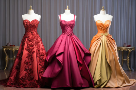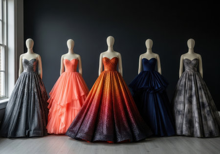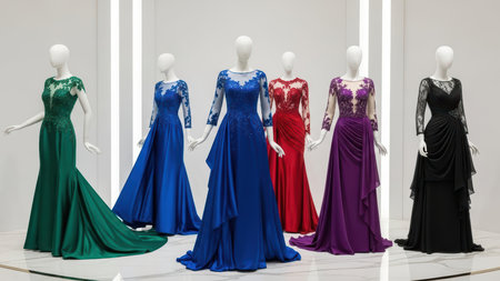 Selection of colorful evening dresses showcased on mannequins