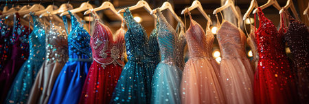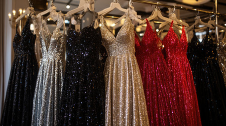 A stunning collection of sparkling evening gowns showcased in a chic boutique, featuring vibrant colors and exquisite detailing, perfect for special occasions.