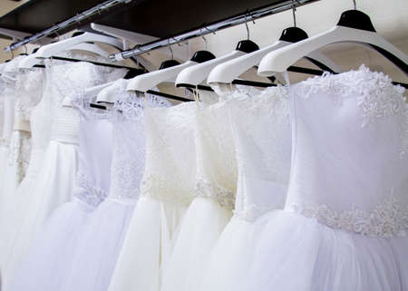 Wedding dresses for bride on hangers against white background loft store. Concept wedding, engagement, attributes, clothing, love.