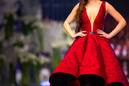 Female model walks the runway in a red dress during a Fashion Show. Fashion catwalk event showing new collection of clothes.