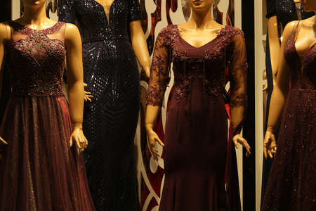 Long evening dresses on mannequins in fashion boutique. Party dress for special ocassion.