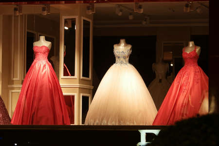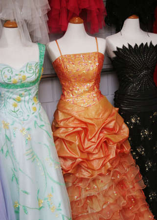 Mannequins wearing beautiful evening dresses.