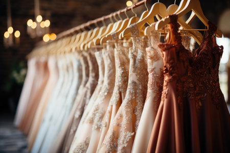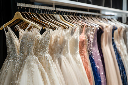 Elegant bridal dresses displayed in a boutique showcasing various designs and colors for wedding preparations Generative AI