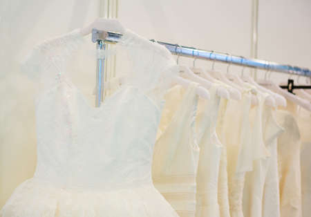wedding dresses in hanging on a hangers in store
