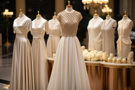 Elegant luxurious dresses on mannequins in a store