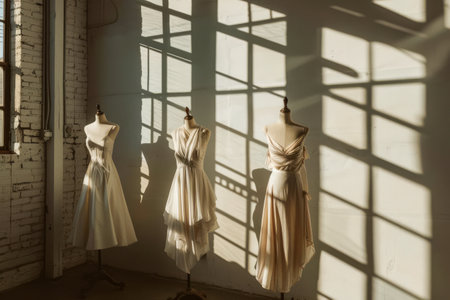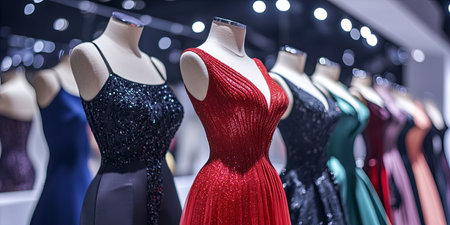 Fashionable dresses displayed on mannequins with a white background, ideal for showcasing fashion details and copy