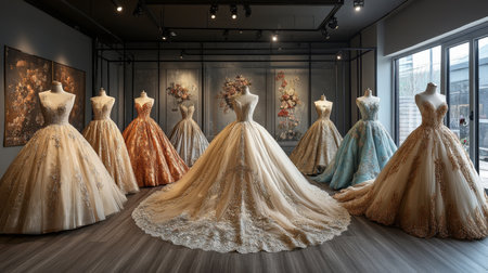 Stunning collection of elegant gowns displayed in a modern boutique with soft lighting and exquisite floral decor Generative AI