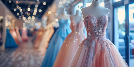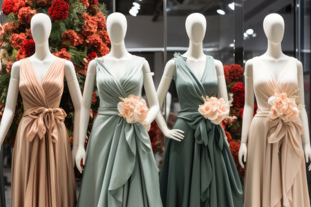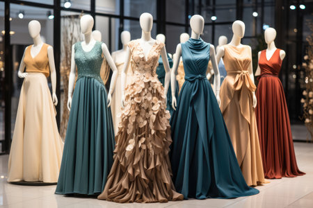 Beautiful evening dresses on a mannequin in a womens clothing store. AI generated illustration