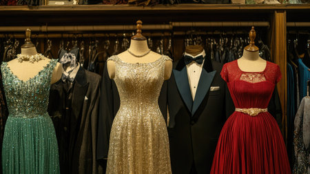A captivating display of vintage evening dresses and formal attire in a boutique, showcasing a range of colors and styles designed for elegance and sophistication.