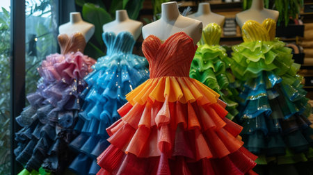A stunning display of elegant evening dresses in vibrant colors and luxurious materials showcased in a boutique window, perfect for formal occasions and celebrations.