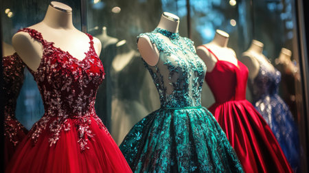 A collection of exquisite evening gowns showcased in a boutique window, featuring rich colors like red and teal with detailed embellishments against a softly lit background.