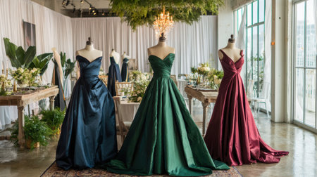 Three elegant gowns displayed at a sophisticated event, showcasing beautiful fabrics and colors, complemented by stylish decor and floral elements in a bright venue.