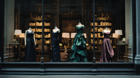 A stunning display of elegant evening gowns showcased in a boutique window, featuring rich colors and sophisticated styling within a cozy library ambiance.